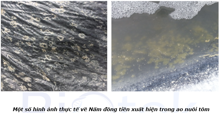 Nấm đồng tiền là một loại nấm giống địa y, gồm nhiều bào tử nấm và có mùi tanh, thường bám vào các thiết bị giá thể trong ao nuôi.