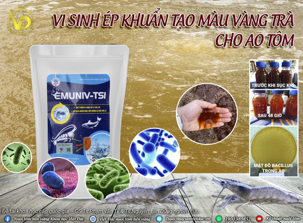 Emuniv Ts1 sau khi sục khí 48h sẽ loại bỏ được các chủng vi khuẩn Vibrio gây bệnh gan tụy – phân trắng – lỏng ruột trên tôm và tạo hệ đệm cho môi trường nước kích thích mầm tảo silic phát triển tạo ra màu vàng trà vàng chanh óng ánh.
